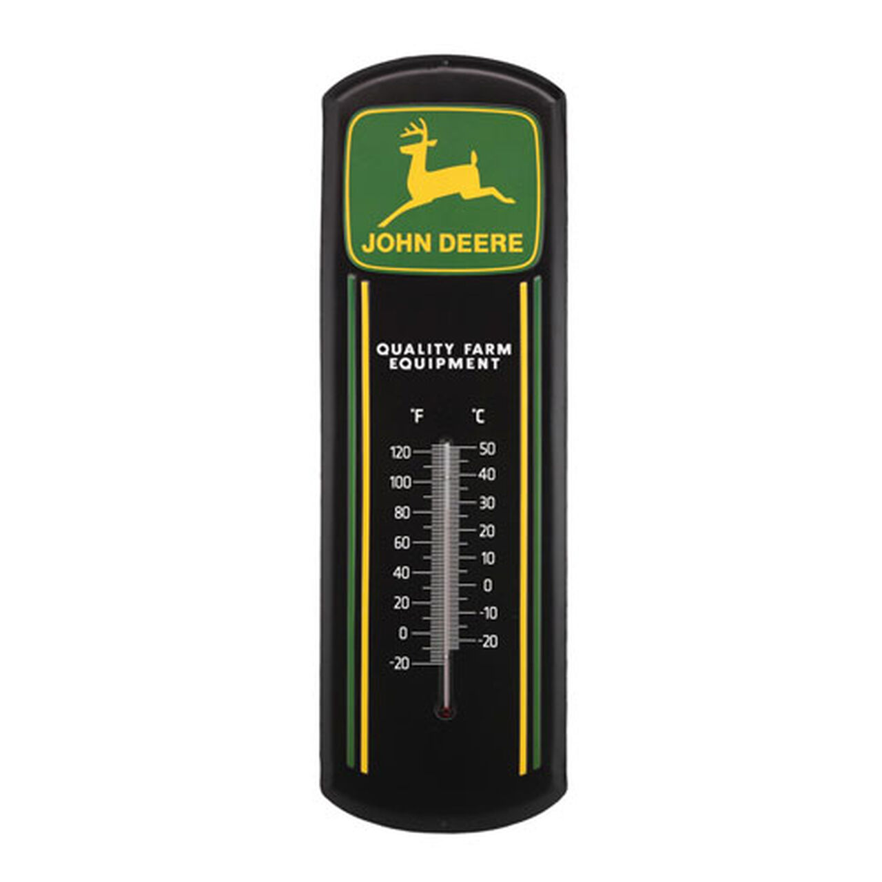 This functional piece features a black background with classic green and yellow logo and stripes. Thermometer is made for outdoors with weather resistant die cut tin. Measurements: 9" W x 27" H