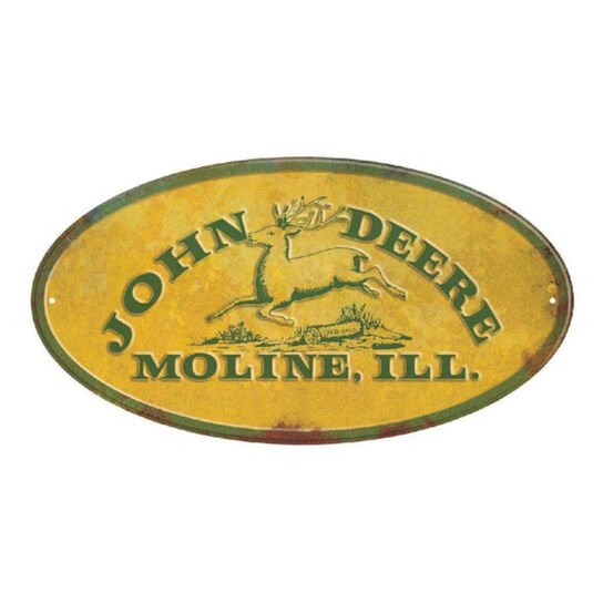 9.5" x 17 .7" Oval John Deere Moline Ill. yellow sign. Made in the USA. Made from recycled Aluminum. Embossed for clean raised look. This is a Licensed John Deere Product.